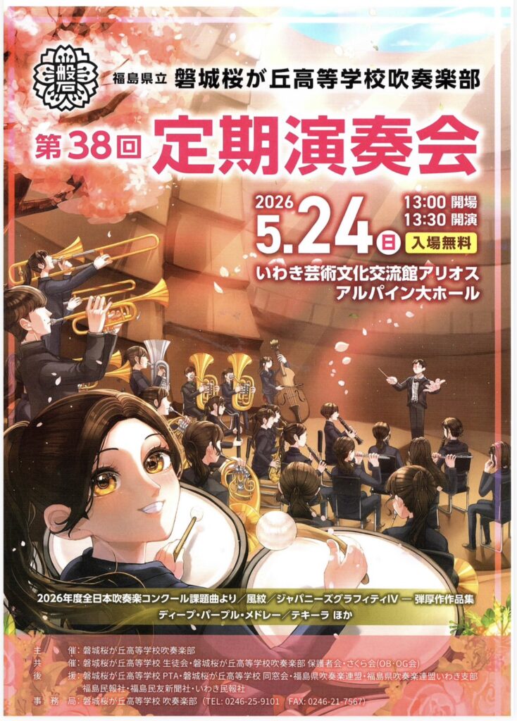 弊社ではこの度「磐城桜が丘高等学校吹奏楽部 第38回定期演奏会」に協賛をさせていただきました。 部員の皆さん、日ごろの練習の成果を思う存分発揮して、素晴らしい演奏を披露してください! 「株式会社 福眞」は、これからも「頑張る人」を応援してい... -